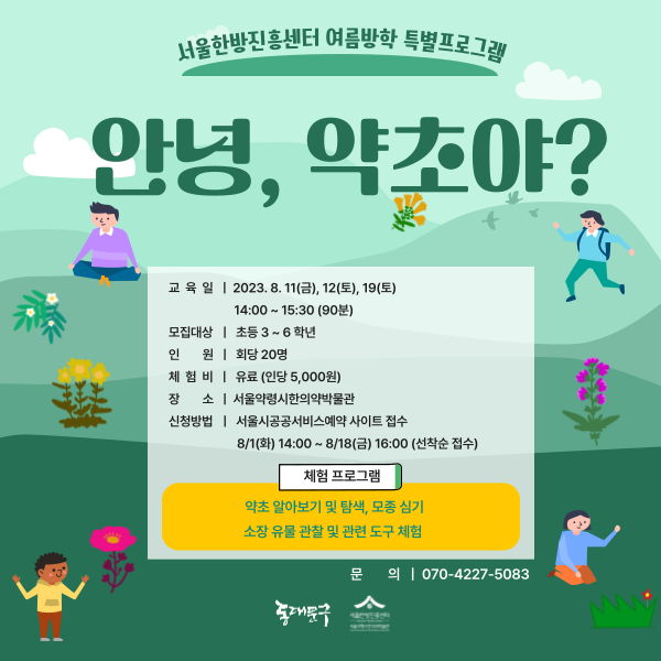|  안녕하세요! '서울한방진흥센터'입니다! 이번에 서울한방진흥센터에서 아주 특별한 프로그램을 준비했습니다. 우리 주변에서 쉽게 접할 수 있는 약초와 박물관 소장 유물을 관찰하고 체험해보는 여름방학 특별 프로그램입니다 ▦ 여름방학 특별 프로그램 안녕, 약초야? 개요 ✔교육일 | 2023. 8.11(금), 12(토), 19(토) 14:00~ 15:30 (90분) ✔모집대상 | 초등 3 ~ 6 학년 ✔인원 | 회당 20명 ✔체험비| 유료 (인당 5,000원) ✔장소 | 서울약령시한의약박물관 ✔신청방법 | 서울시공공서비스예약 사이트 접수 8/1(화) 14:00 ~ 8/18(금) 16:00 (선착순 접수) https://yeyak.seoul.go.kr/web/reservation/selectReservView.do?rsv_svc_id=S230801130859768221 ✔체험 프로그램 약초 알아보기 및 탐색, 모종 심기, 소장 유물 관찰 및 관련 도구 체험 우리 이번 여름방학엔 함께 약초에 관해서 알아보아요! | |