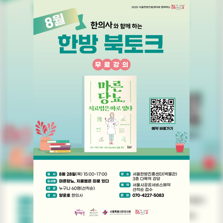 ? 일시 : 8월 28일(목) 오후 3시 ~ 5시 ? 장소 : 서울한방진흥센터 3층 다목적 강당 ? 신청 방법 : ‘서울시공공서비스예약’에서 선착순 접수 | |