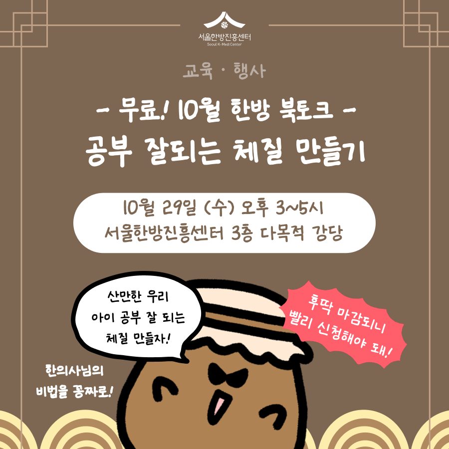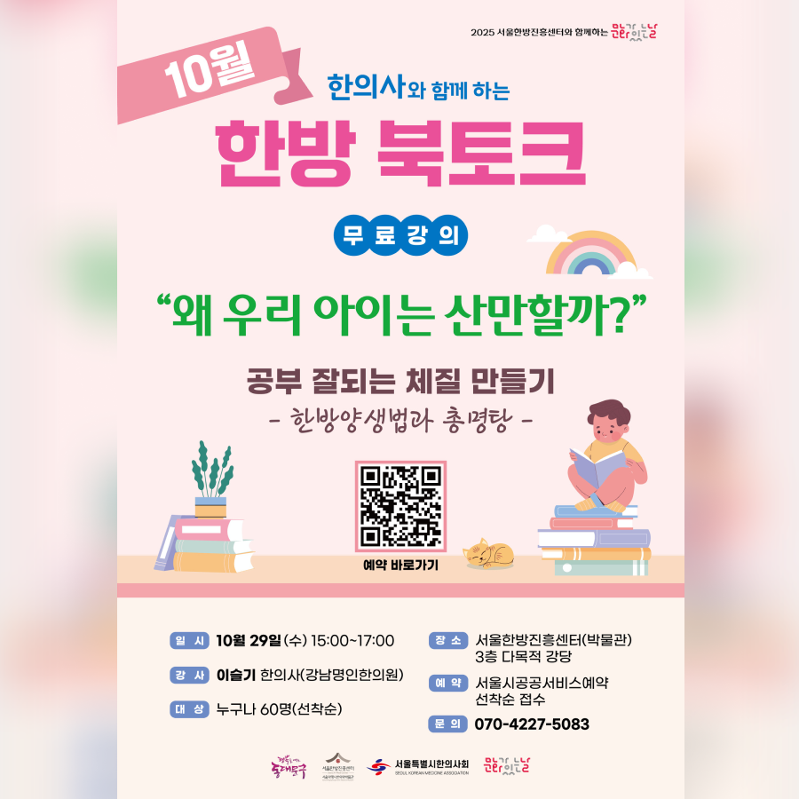 |  요즘 들어 집중이 잘 안 되시나요? 그럴 땐 “괜찮겠지” 하고 넘기기보다, 몸의 근본적인 원인을 살펴보는 게 중요합니다. 이번 북토크에서는 한의학의 관점에서 ‘집중력’을 다룹니다. 한의사 선생님께서 전통 한방 이론을 바탕으로 집중력 향상에 도움이 되는 생활 습관과 건강 관리 팁을 나눠주실 예정이에요. 형식은 딱딱한 강의가 아닌, 편안하게 들을 수 있는 북토크입니다. 부모님, 연인, 친구와 함께 오셔도 좋고, 부담 없이 즐길 수 있는 시간으로 준비했습니다. 무료로 진행되니, 선착순 마감 전에 꼭 신청해 주세요! ? 일시 : 10월 29일(수) 오후 3시~5시 ? 장소 : 서울한방진흥센터 3층 다목적 강당 ? 신청 : ‘서울시공공서비스예약’에서 선착순 접수 https://yeyak.seoul.go.kr/web/reservation/selectReservView.do?rsv_svc_id=S250926143048095607  | |